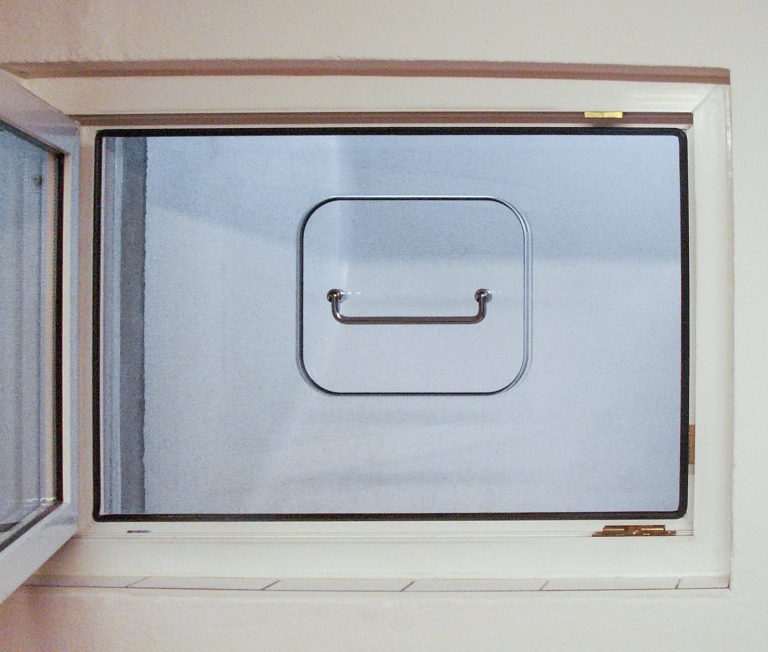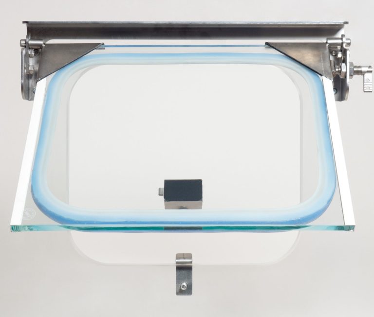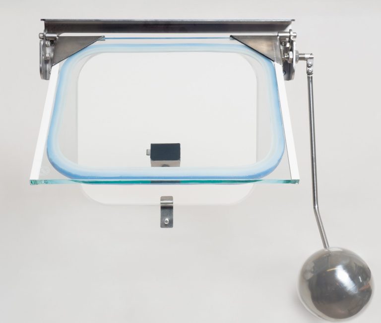 Das manuelle Hochwasserschutzfenster besteht aus einer 20mm starken Acrylglasscheibe und einer Lüftungsöffnung mit Deckel.