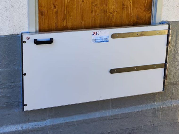 Das Chiemgauer Hochwasserschutz-System eignet sich unter anderem besonders für Haustüren, Kellerfenster und Tankraumluken. Das System kann auf oder in die Leibung montiert werden.